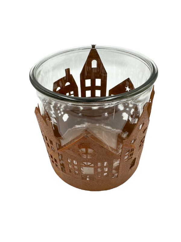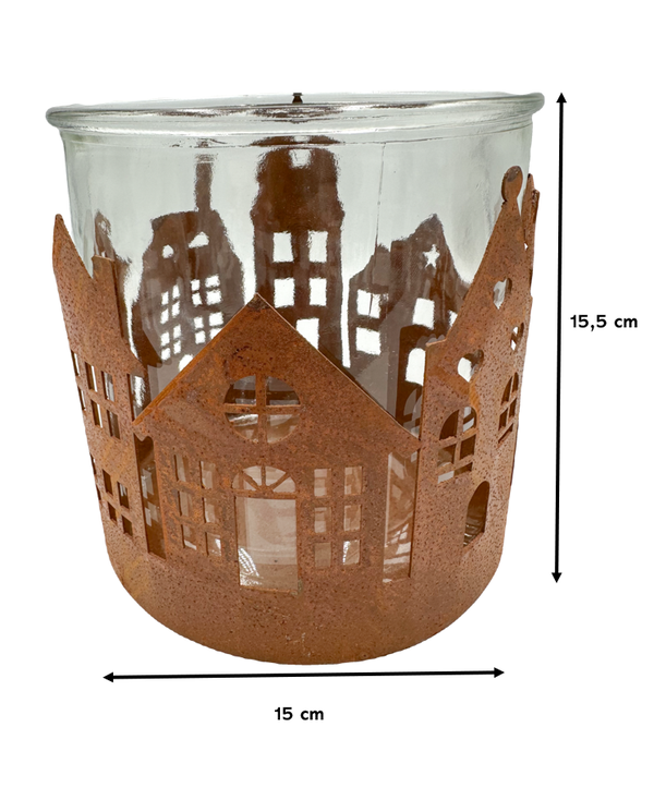 Breng warmte en gezelligheid in huis met deze roestkleurige metalen kaarsenhouder met huisjesthema. Dankzij het glas schittert het kaarslicht prachtig door de raampjes, wat zorgt voor een knusse en betoverende gloed.